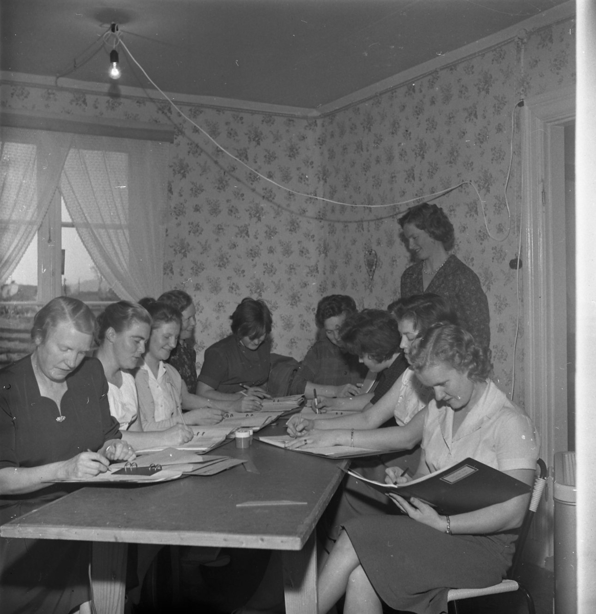 Några kvinnor sitter runt ett bord och skriver i pärmar. De sitter i ett rum med blommiga tapeter.
