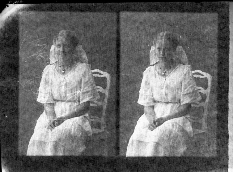 Porträtt av en flicka i ljus klänning med stor rosett i nacken. Hon sitter på en stol. Två bilder på samma glasplåt.