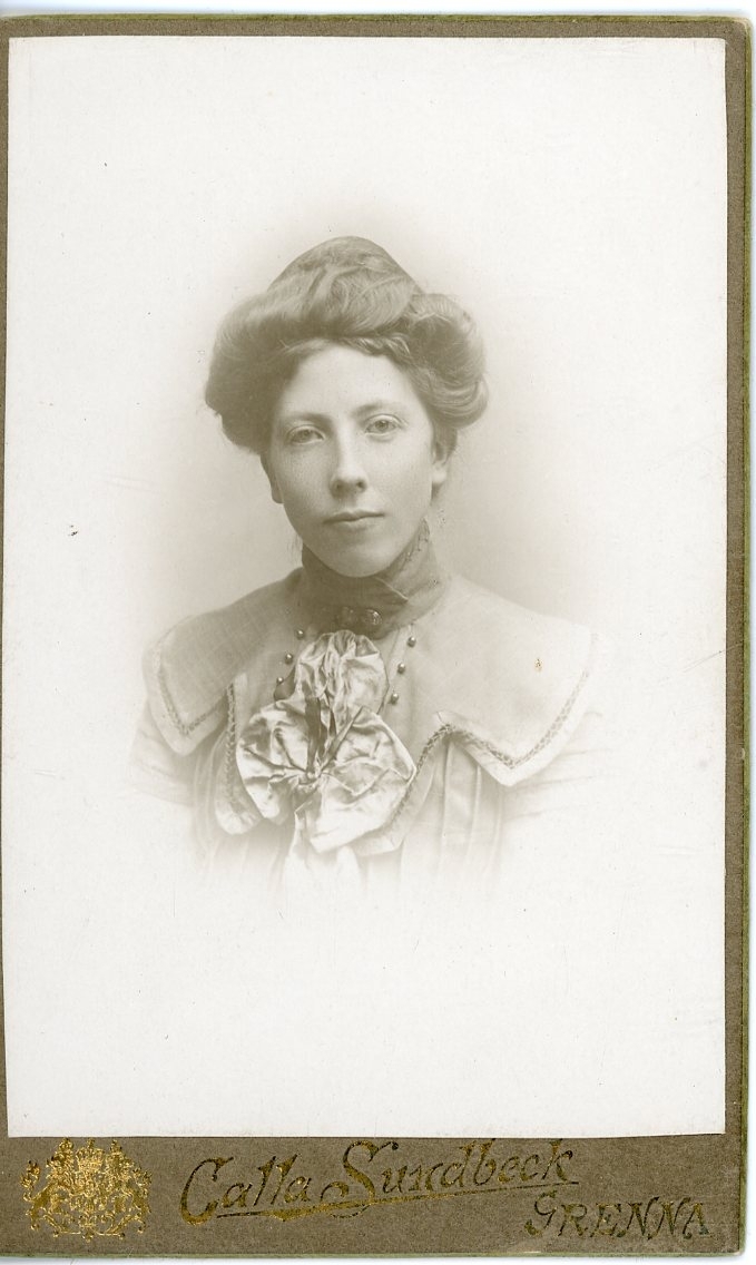 Kabinettsfotografi: en okänd ung kvinna med stort rosett på bröstet.