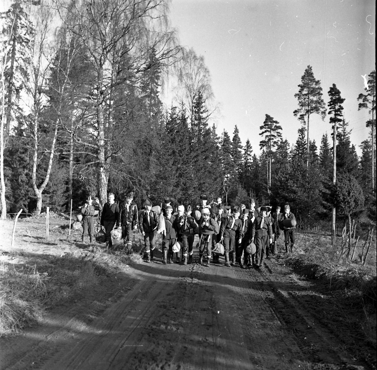 En grupp unga scouter står uppställda för fotografering. De står på en lerig väg vid ett skogsbryn.