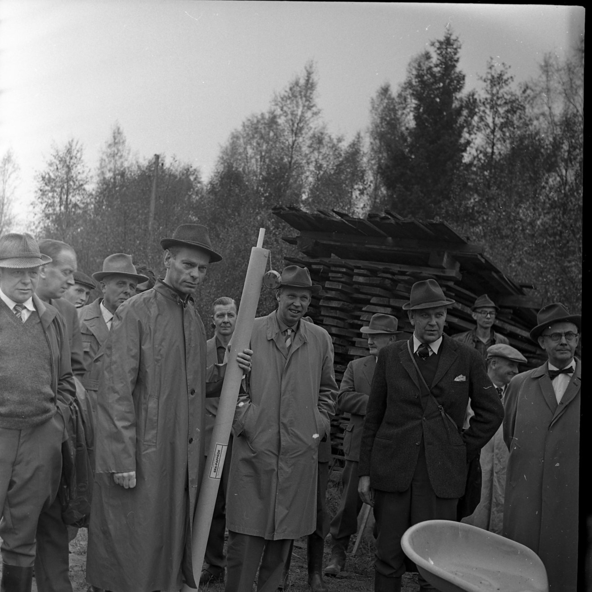 Skogsdag Örserums brunn 1961. Flera män står och tittar på någonting utanför bild. De bär rockar eller regnjackor. Bakom dem står en stapel med bräder.