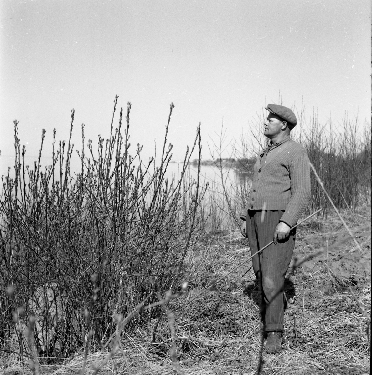 En kepsbeklädd man står vid ett vattenbryn. Framför sig har han en stor buske. Han håller en pinne i handen.