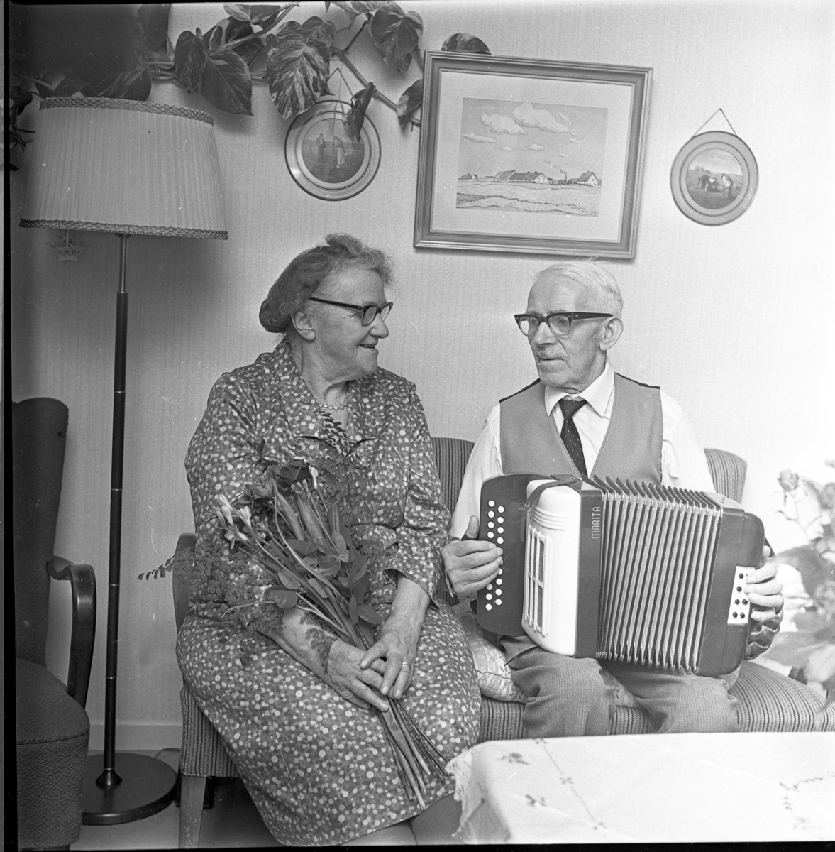 Ett äldre par sitter i en soffa, kvinnan har en blomsterbukett i famnen. Mannen spelar dragspel. De firar guldbröllop.