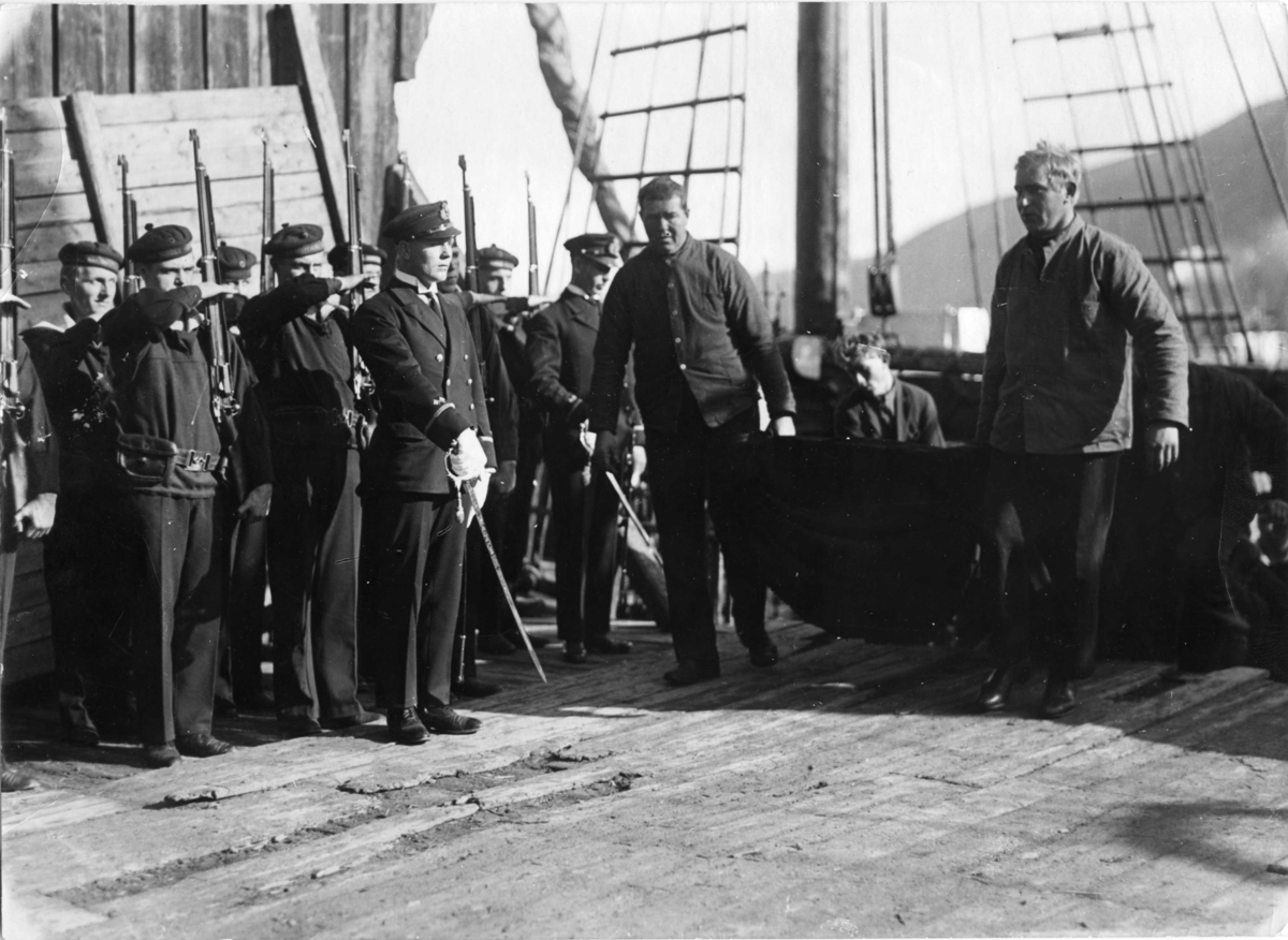 Kista med Andrée och Strindberg bärs iland från Bratvaag i Tromsö.