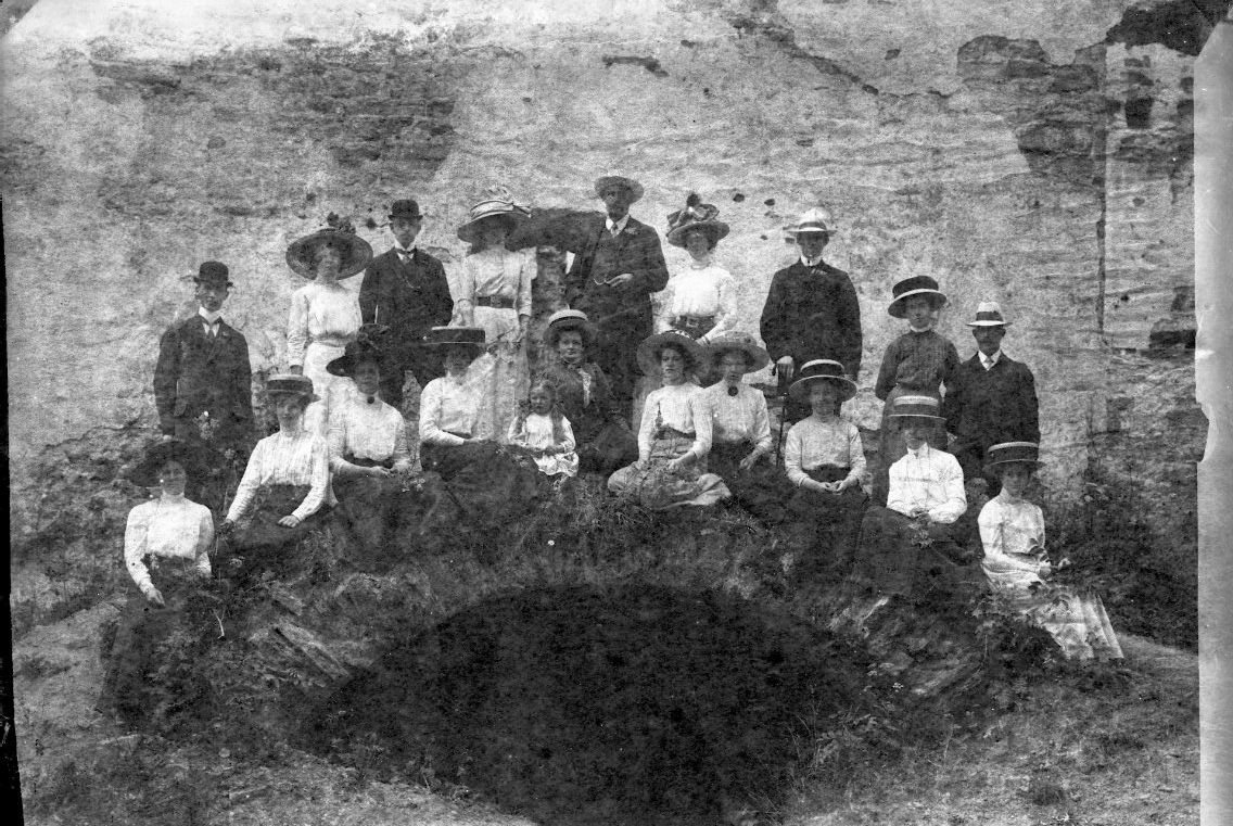 En grupp kvinnor och män på Visingsborgs slotts inre borggård. Det är sommar.