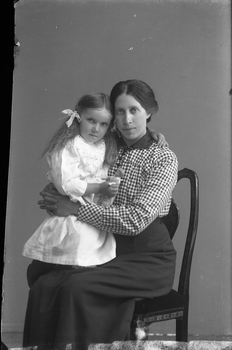 Porträtt av en kvinna med en liten flicka i sin famn.