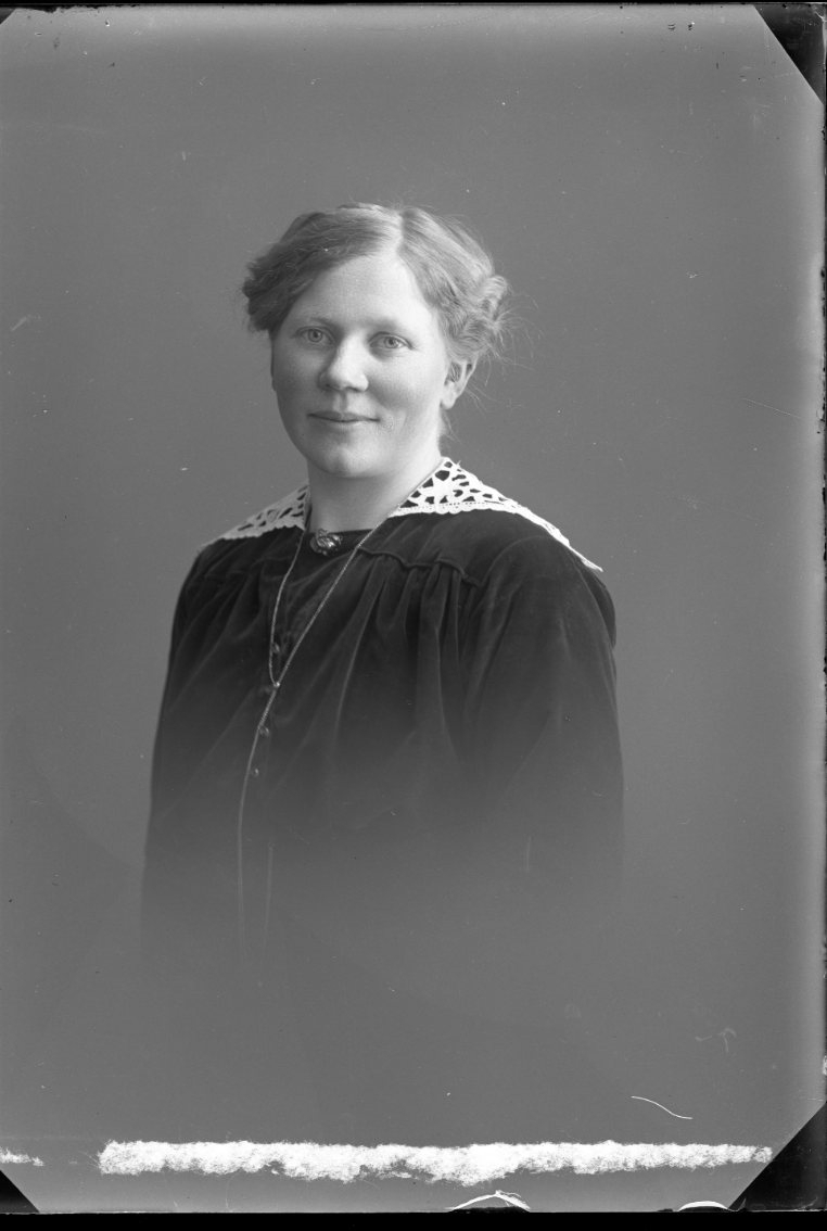 Porträtt av en kvinna i mörk klänning med vit spetskrage.