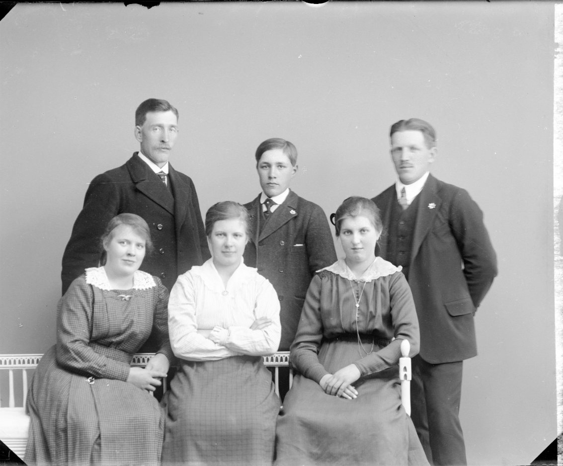 Gruppbild med tre kvinnor och tre män, kvinnorna sitter i en soffa och männen står bakom dem.