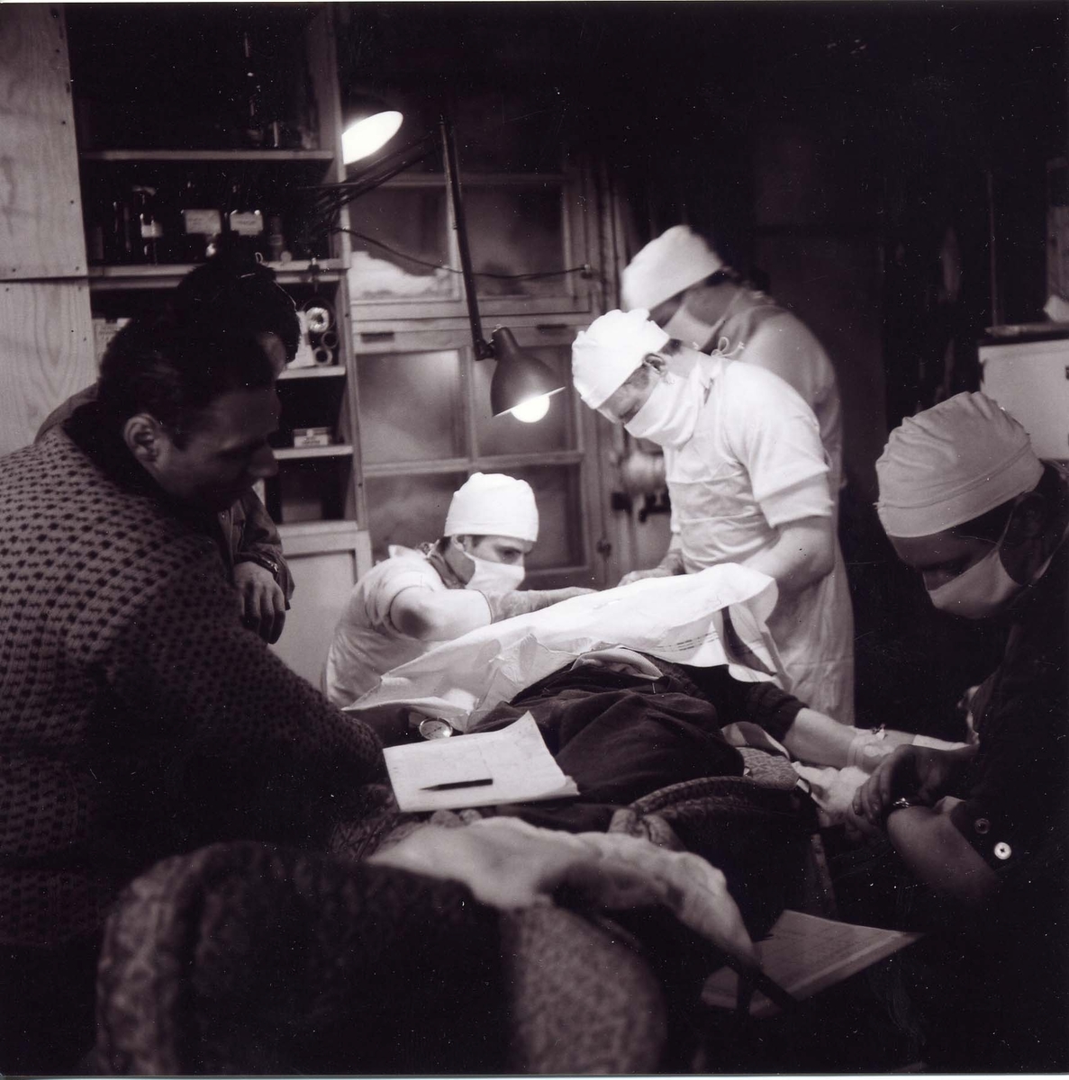 "Under operationen av Allans öga, från vänster Gösta Liljequist, meteorolog, Ove Wilson, läkaren, Fred Roots geolog och bakom honom står Valter Schytt glaciolog, längst till höger Stig Hallgren fotograf, ger narkos."