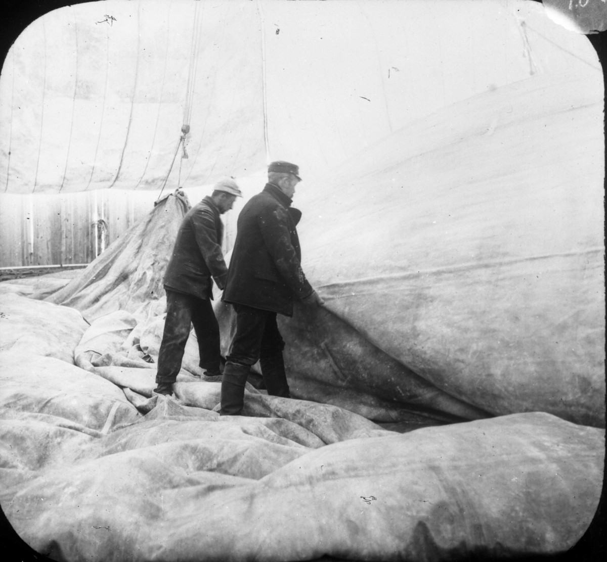 Swedenborg och troligen Stake vecklar ut ballongen i ballonghuset. Glasplåt.