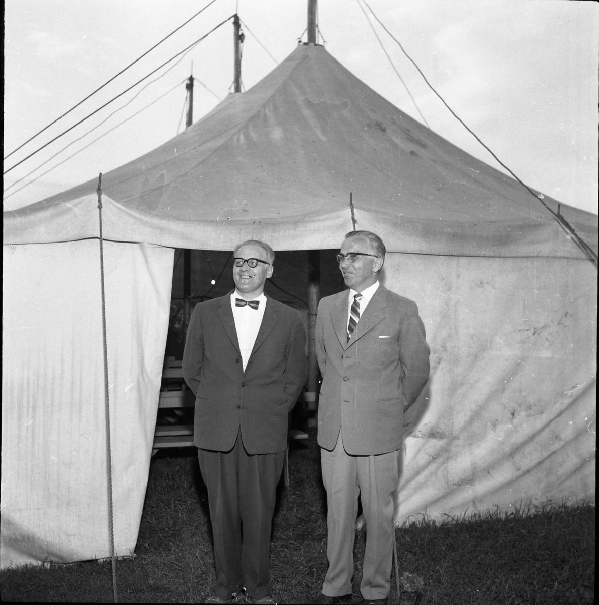 Två män står framför en tältöppning. Mannen till höger är pastor Robert Svensson.