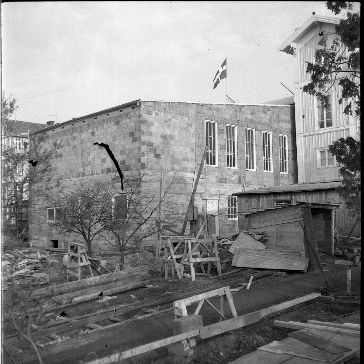 Titel: Byggnation av Filadelfiakyrkan är pågående. Fotograferat från gårdssidan av Brahegatan 75a (Hjertströmska gården). En svensk flagga är hissad på kyrkans tak.