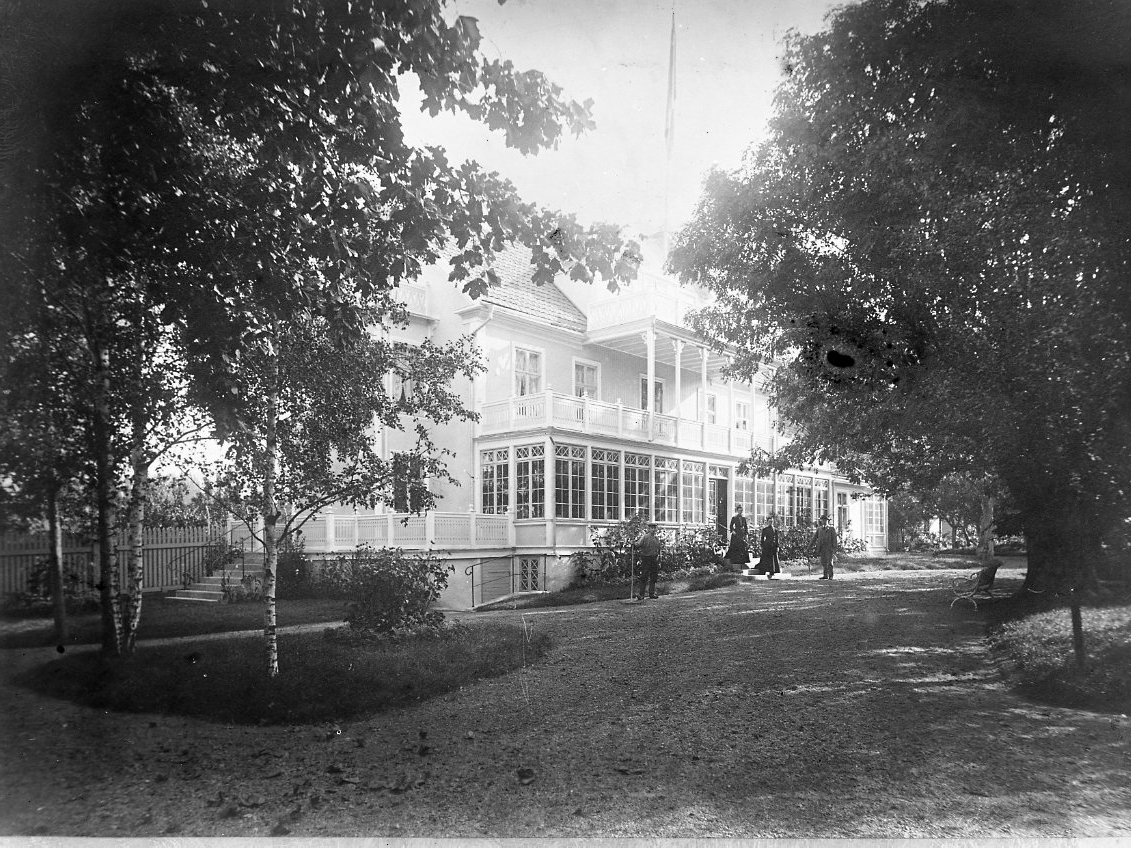 Gårdssidan av Ribbagården. Till vänster står en ung man med en kratta. Vid trappa till baksidans entré står en man och två kvinnor. Möjligen baron A C von Düben och hans mamma och syster.