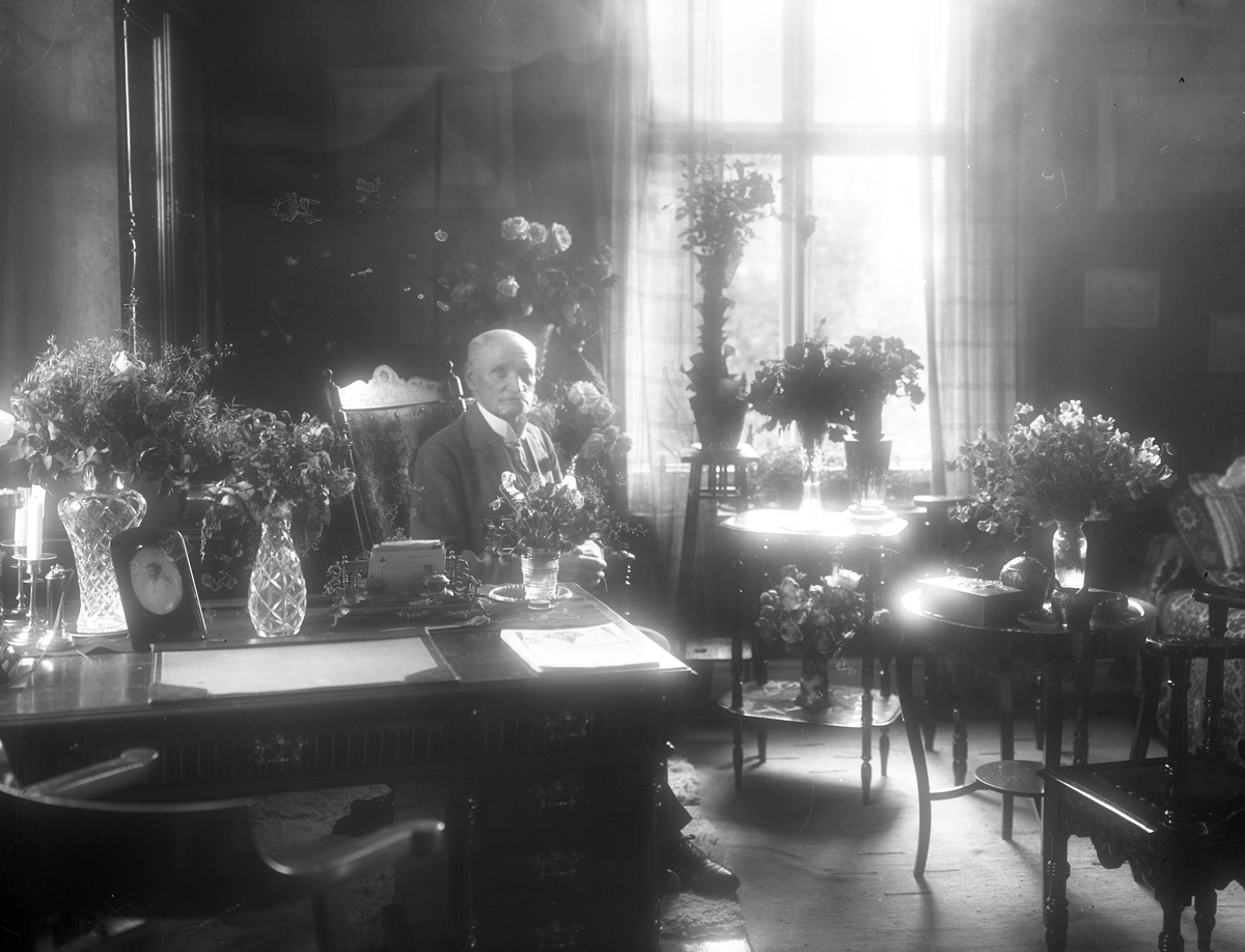 En hemmiljö. En äldre man sitter vid ett bord omgiven av mycket blommor. Troligen en högtidsdag.