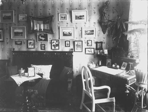 Interiör från ett hem. Randig tapet med blommotiv, ett stor antal små tavlor med målningar, teckningar och fotografier. En skulptur på väggen föreställande en lätt klädd flicka. Ett skrivbord med bland annat brevvåg och några porträttbilder till höger vid ett fönster. En soffa med hög rygg och ornamenterad trästomme. Litet kurvig pelarbord med en tennskål och en teckning troligen föreställande en hund.
