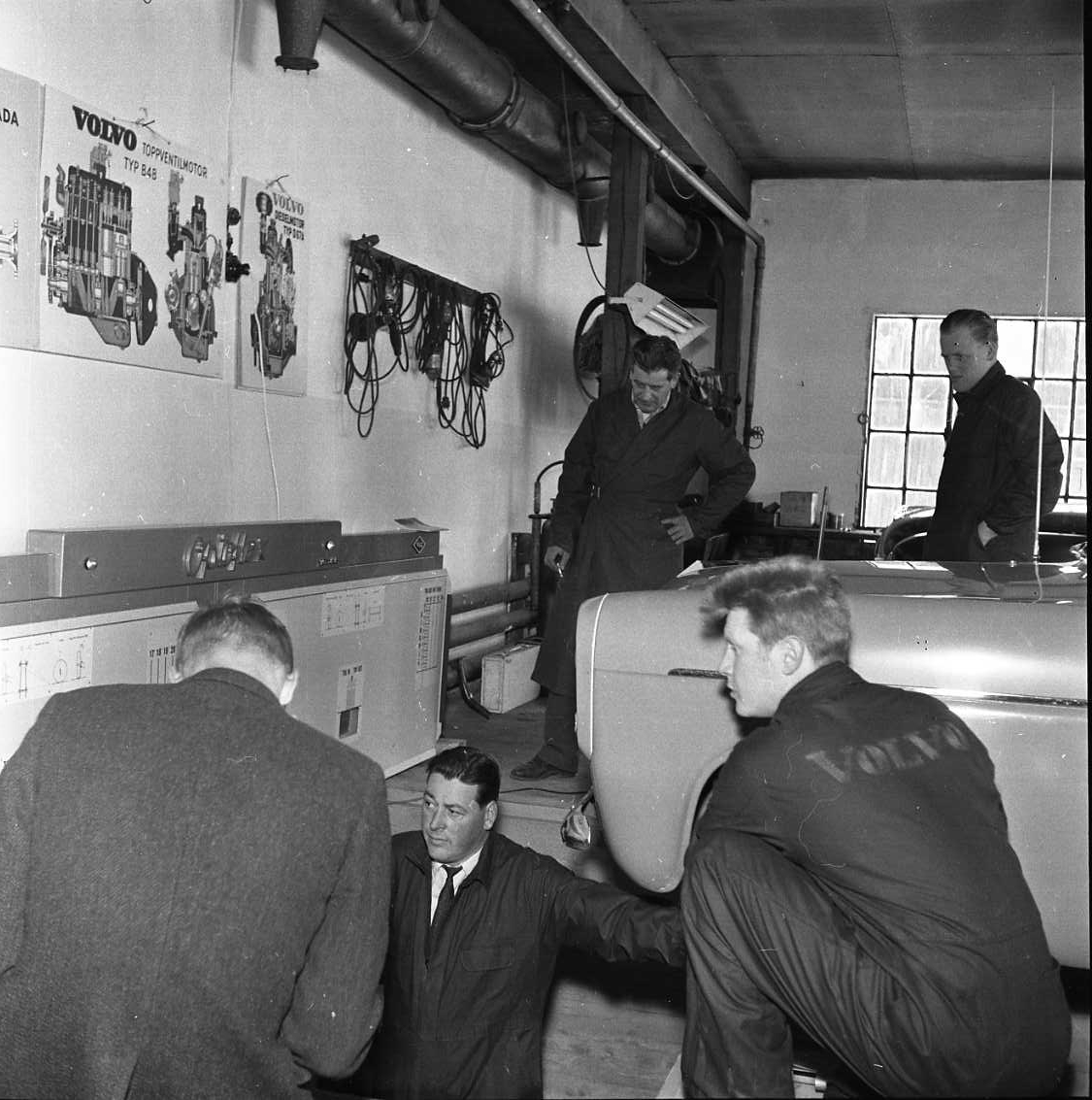 Fyra män i en bilverkstad, varav en står i smörjgropen (med slips) vid fronten av en bil. En män bär overall med "VOLVO" tryckt på ryggen. På väggen sitter illustrationer över växellåda och toppventilmotor för Volvo