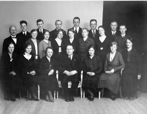 Gruppbild med Gränna Missionsförsamlings sångkör, ett 20-tal kvinnor och män. Främre ledet sitter i soffa och på pallar av gustaviansk stil med randigt tyg.