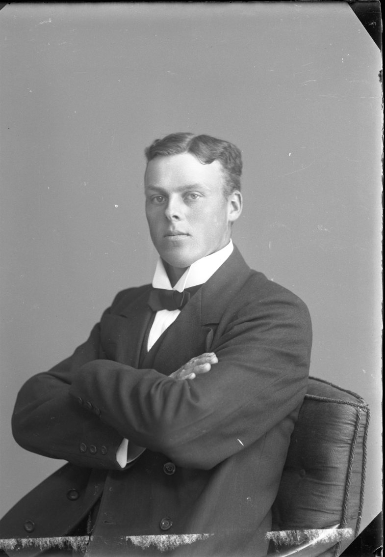 Titel: Porträtt av en ung man som sitter med armarna i kors.