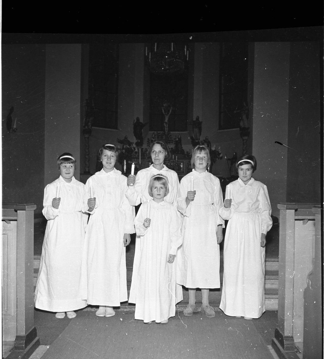 En luciakör står framför ett altare. De bär vita skrudar och håller i varsitt levande ljus.