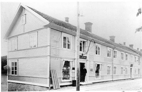 Tvåvåningsbyggnade utmed Brahegatan i Gränna. En man med keps står under södra dörren och en skylt "C. J. Roman". Våningsplanen har liggade panel men två band med diagonal panel längst ned, mellan våningsplanen och på gaveln. Skyltfönster med markiser.