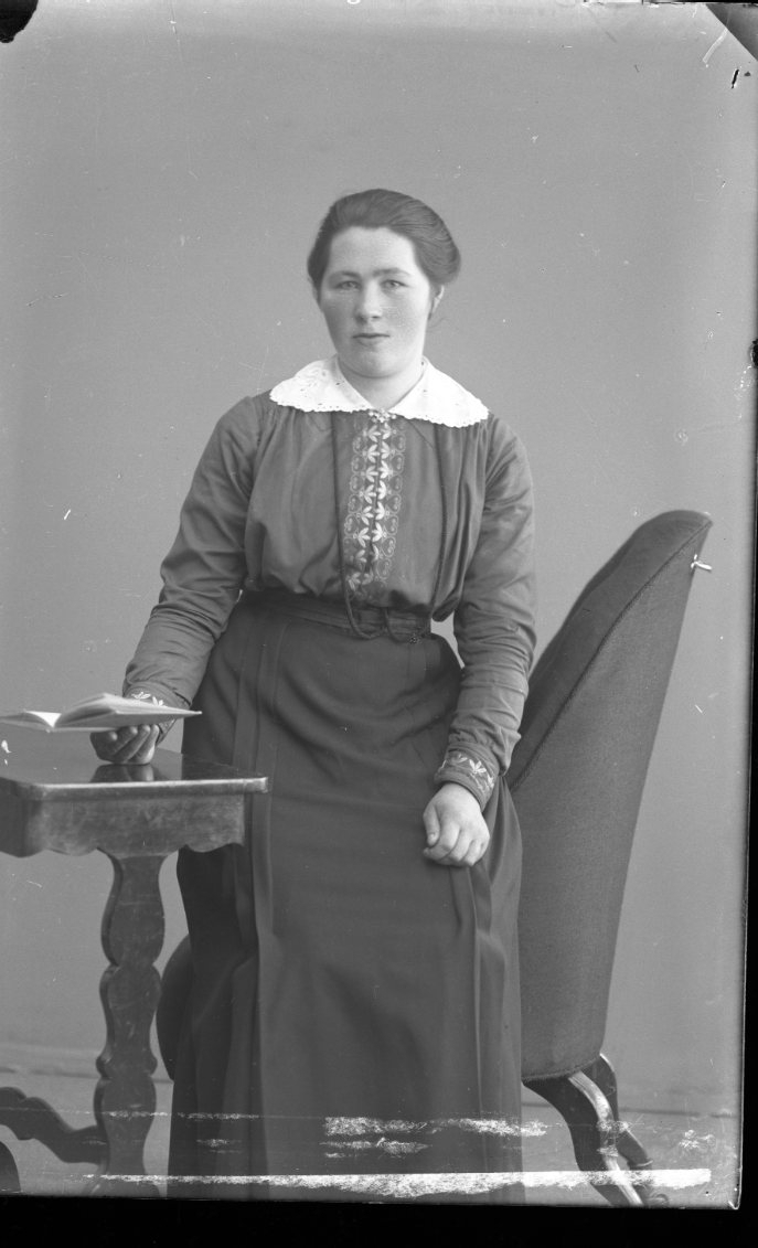 Porträtt av en kvinna med spetskrage. Hon sitter på armstödet till en fåtölj med en bok i händerna.