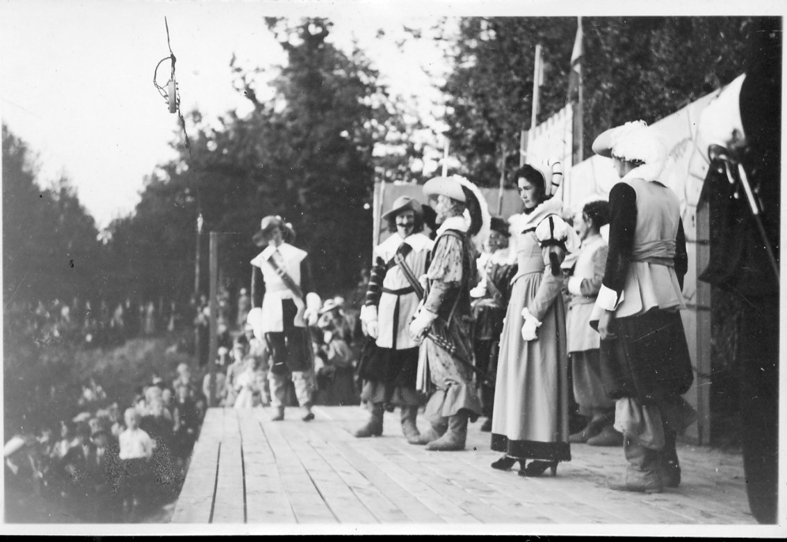 Amatörskådespelare på en scen med scenografi förställande en borg. En stor publik anas till vänster nedanför scenen.