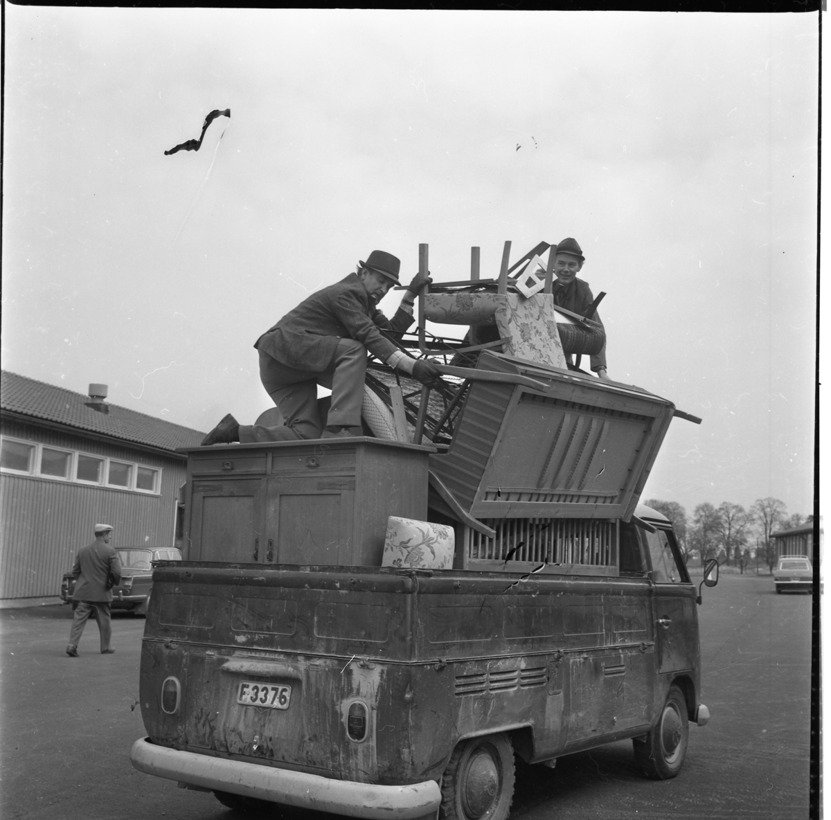 En Volkswagen pickup fullt lastad med olika möbler och högst upp två män som packar.