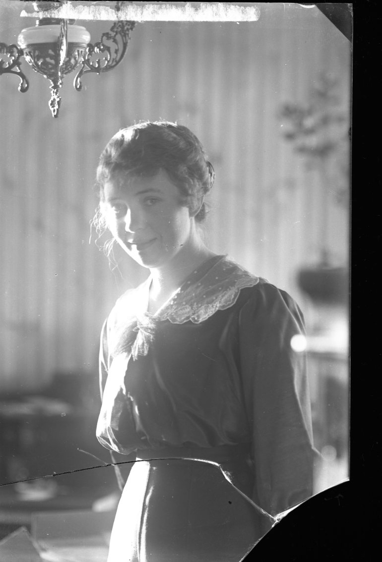 Porträtt av en ung kvinna som står under en taklampa, solen lyser in från vänster.