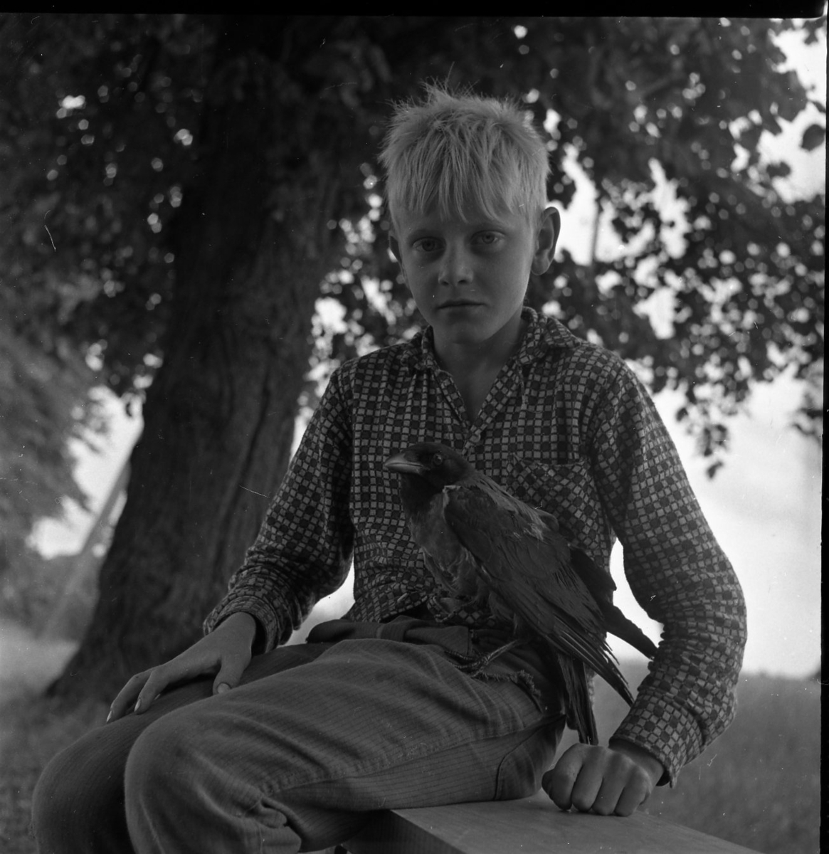 En pojke sitter på ett staket och han har en kråka i knät. Kråkan är tillsynes trygg i pojkens knä.