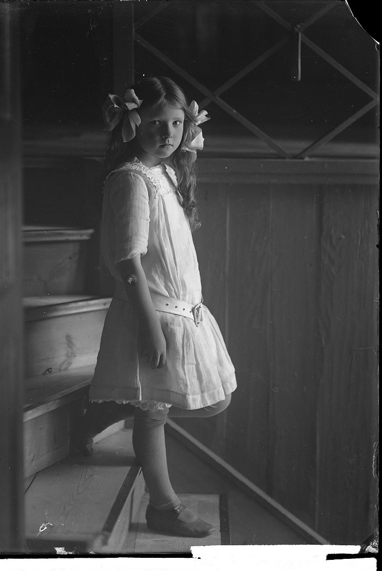 Porträtt av en liten flicka i ljus klänning. Hon står i en trappa, med hästsvan och rosett i håret.