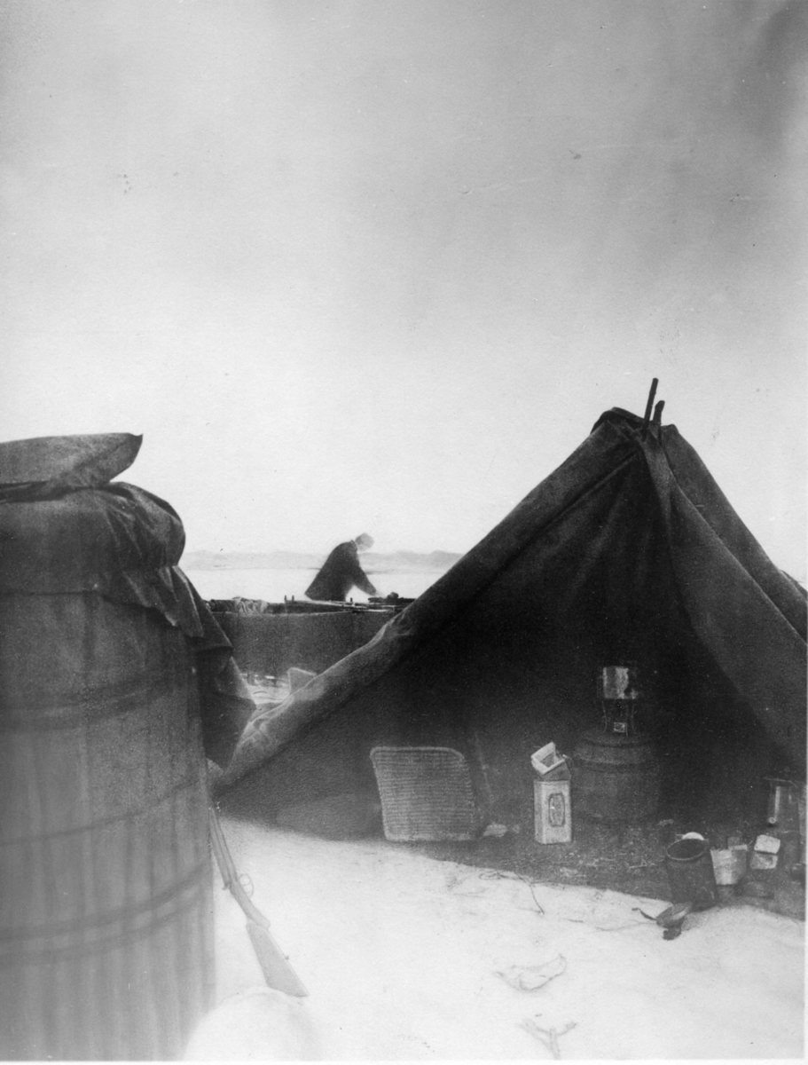 Landningsplatsen. Troligen S A Andrée i bakgrunden vid båten. I förgrunden till vänster del av gondolen, till höger tältet med bland annat primus-köket. Retuscherad version av gm.III-59, dock monobild.