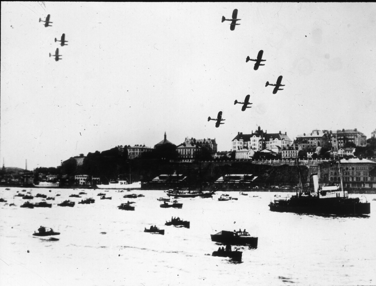 HMS Svensksund, till höger, på väg in mot Stockholm med Vitöfynden. Diapositiv, glas.