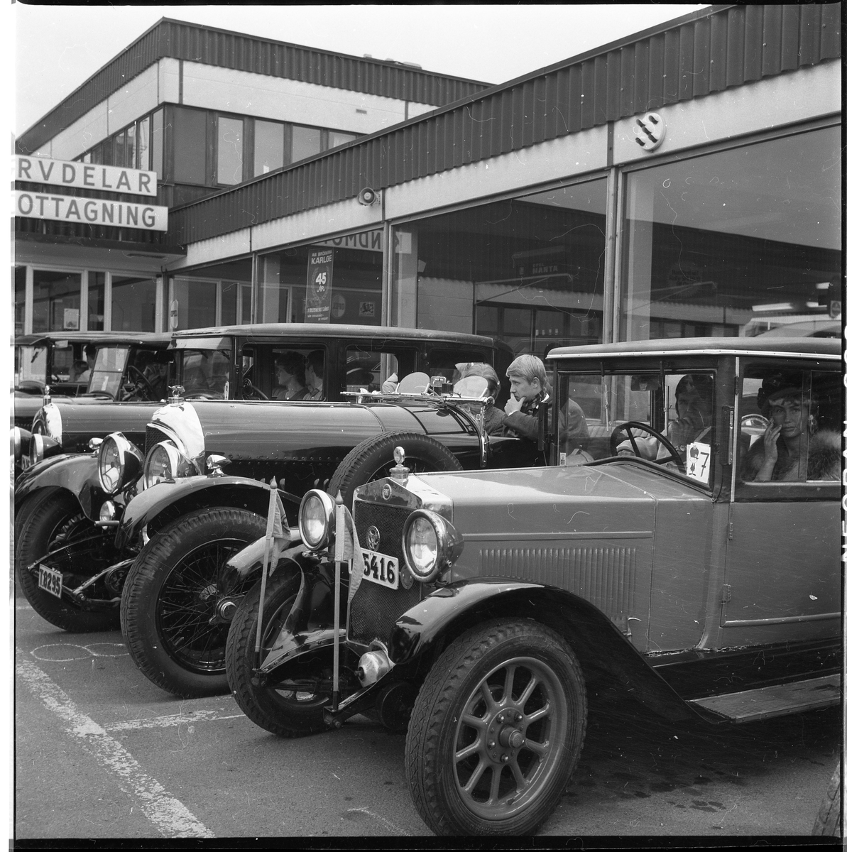 Veteranbilar på rad, troligen vid Karlges bilfirma på Ekhagen, Jönköping.