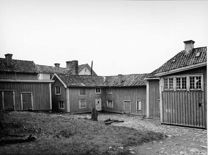 Gårdsmiljö från kv Hjorten 9 i Gränna. På gården ligger ett kapat träd.