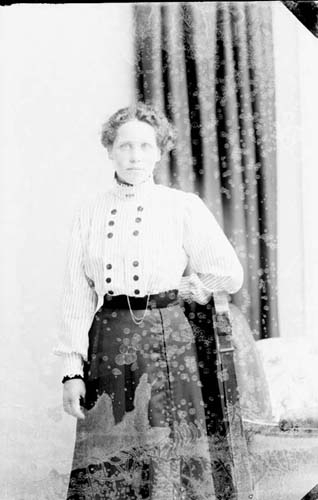 Porträtt av en ung kvinna i ljus blus med dubbla knapprader och mörk klänning.