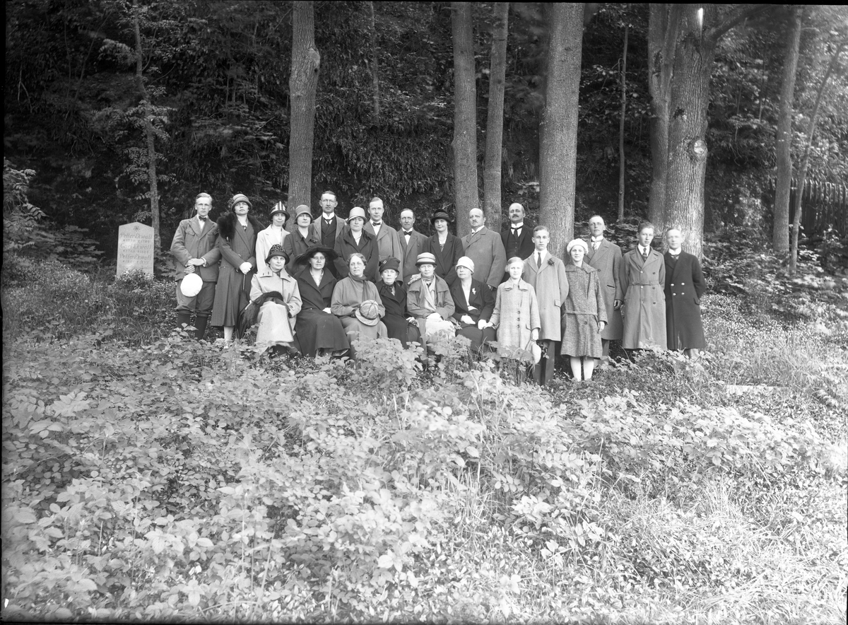 Gruppbild med män, kvinnor och barn sittande och stående intill en gravsten vid bergets fot på Gränna kyrkogård. Det är släkten Ekwall - en Röttlesläkt - som samlats vid Ekwalls familjegrav