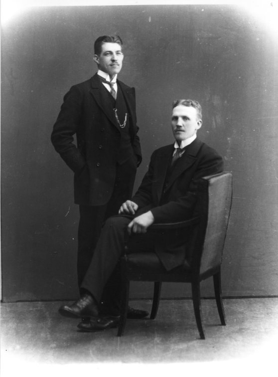 Två män varav en sitter i en stol. Klockkedjan syns på den stående mannen till vänster.