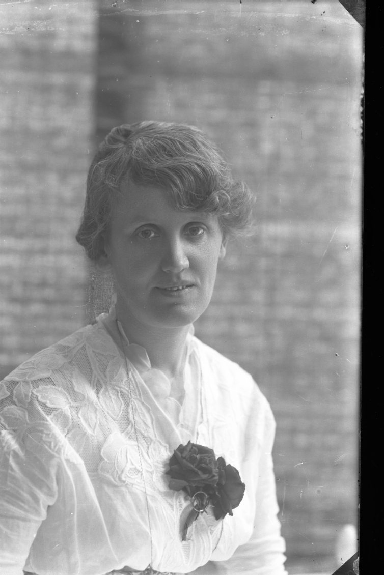 Porträtt av en ung kvinna. Hon bär en ljus tunn blus med blomsterbroderi samt en ros i halslinningen.