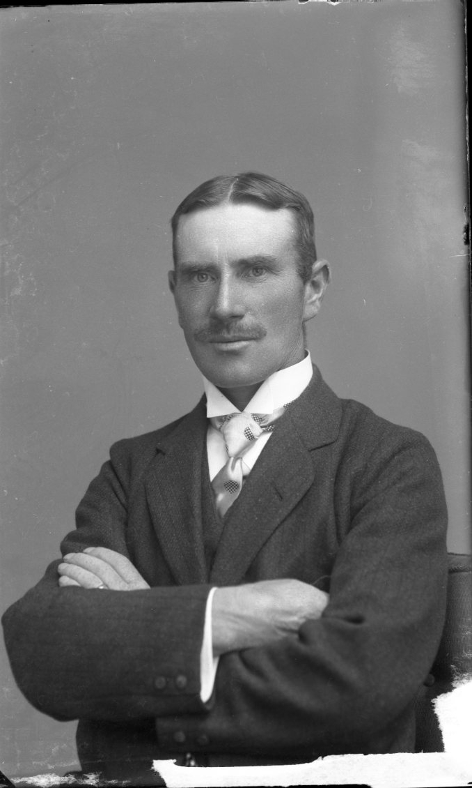 Porträtt av en man med mustasch och slips. Han håller armarna i kors.