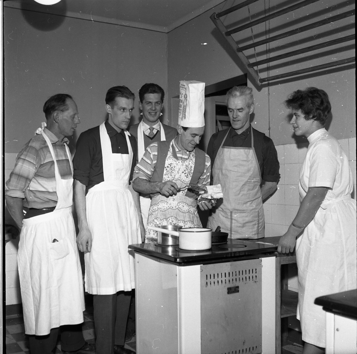 En spis står ut från väggen. Fem män står framför en spis, en kvinna står bakom spisen och tittar på när en man måttar upp smör till stekning. Kvinnan skrattar. Mannen har en mjölpåse på huvudet. Alla bär förkläden. På väggen bakom dem hänger en tvättställning. Troligen en matlagningskurs e dyl.
