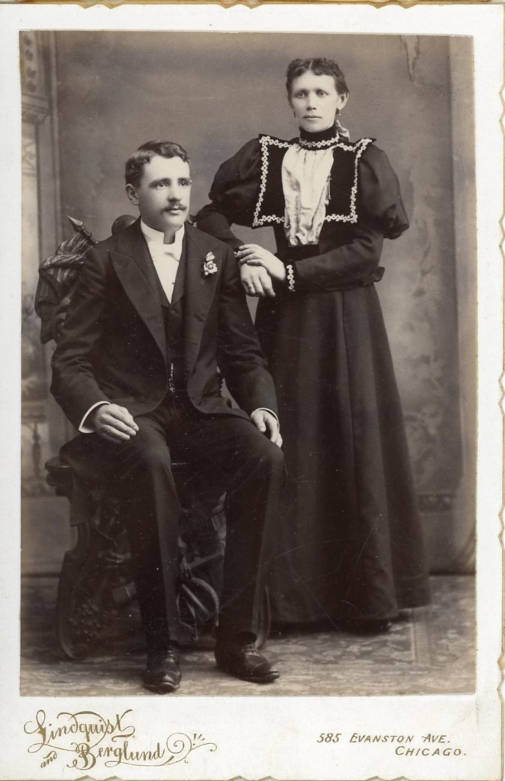 Kabinettsfotografi av ett ungt par. En kvinna står bredvid en sittande man.