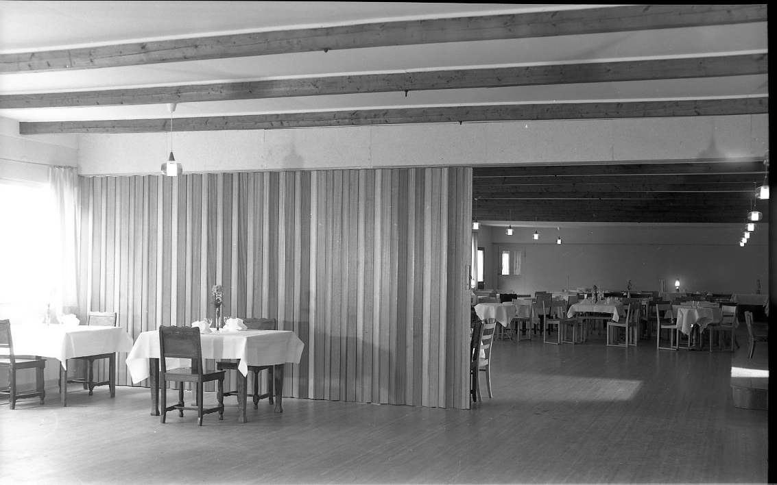 Dukade bord i en stor matsal, en stor vikbar dörr delar av rummet.