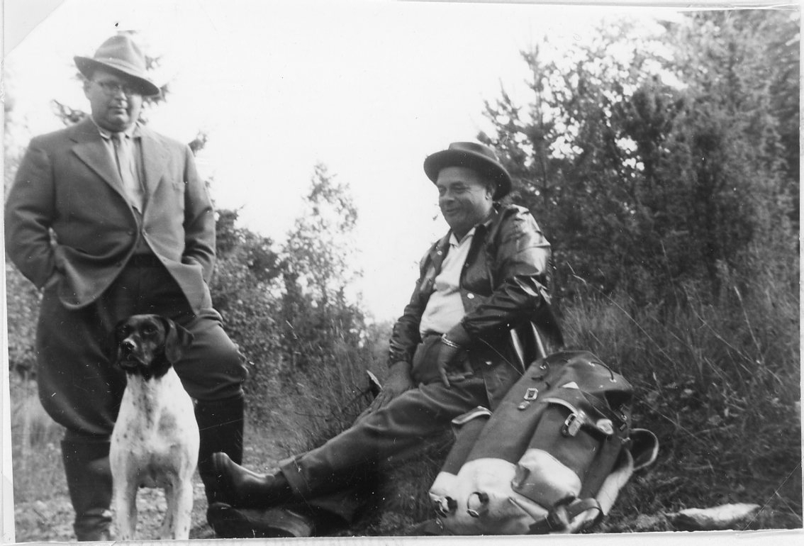 Troligen två jägare som tar en paus vid ett buskage. En man står med en hund framför sig, den andre sitter ner med en ryggsäck intill sig.