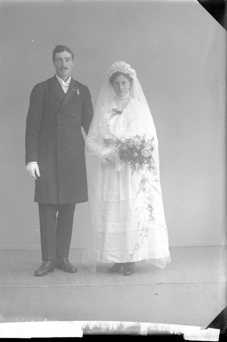 Ett brudpar, bruden i vitt med en bukett i famnen.
