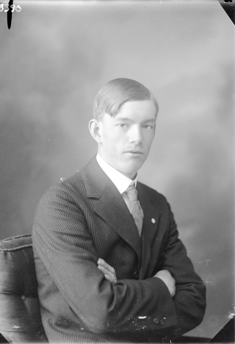 Porträtt av en ung man med mustasch. Han sitter med armarna i kors.