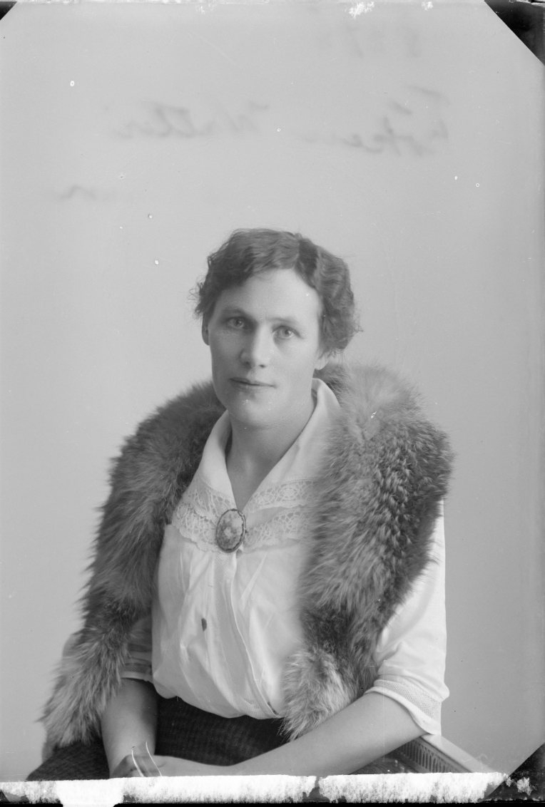 Porträtt av en sittande kvinna med en boa runt halsen och en medaljong.
