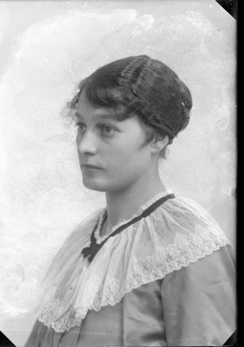 Bröstbild av en ung kvinna med vit spetskrage.