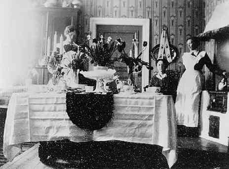 Interiör från köket hos Maria Zielfeldt, "dukat för Mariakaffe". Ett stort bord med ljus duk i förgrunden. På bordet står det blomstvaser, 2 3-armade ljusstakar, kakfat och kaffekoppar. Bakom bordet står en ung kvinna, troligen Anna Larsson. På samma sida utmed väggen sitter bokhandlaren Maria Zielfeldt och intill henne, vid spisen, står en ung kvinna med förkläde. Han har handen på en kaffekittel som står på spisen. Hon är sannolikt hushållerskan Ester Gustafsson.