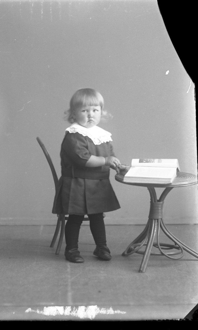 Porträtt av en liten pojke som står vid barnmöbler; en stol och ett bord med en bok.