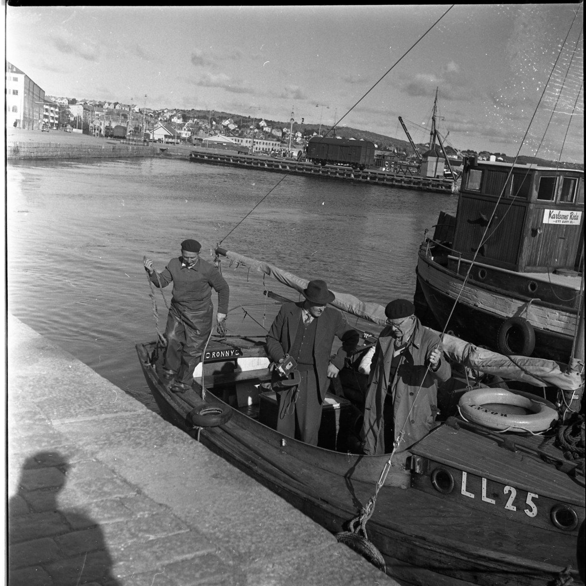 En segelbåt ("Ronny") med inombordare, beteckning "LL24" lägger till vid kaj på okänd ort. Tre män syns i båten.